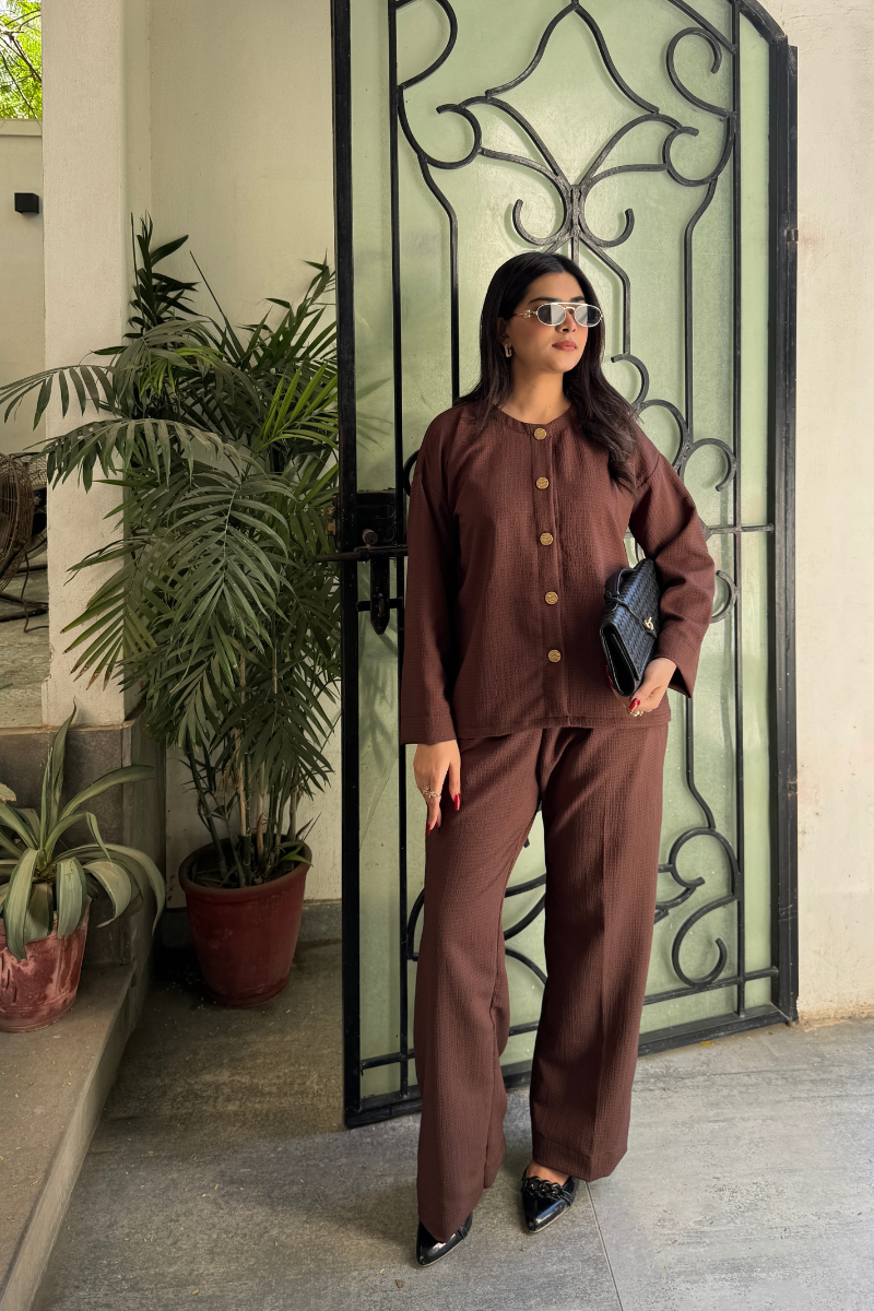 Color: Dark BrownMaterial: Textured IrishIncludes: Two-piece set (Shirt & Trouser)